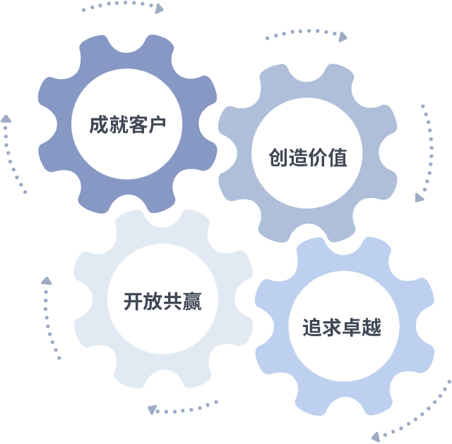 成就客户是一切决策的出发点,,创造价值是衡量所有工作的标准,,追求卓越是我们做事做人的态度,,,开放共赢是我们的格局也是最终的结果。。价值观的齿轮环环相扣,,,,推动着组织里的每个人不断向前。。。